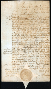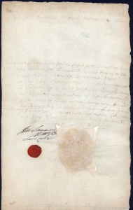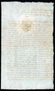 Pismo urzędowe podpisane przez Jana Chwałkowskiego, regenta starosty Przecława Leszczyńskiego i uwierzytelnione pieczęcią starosty 25.08.1660 rok